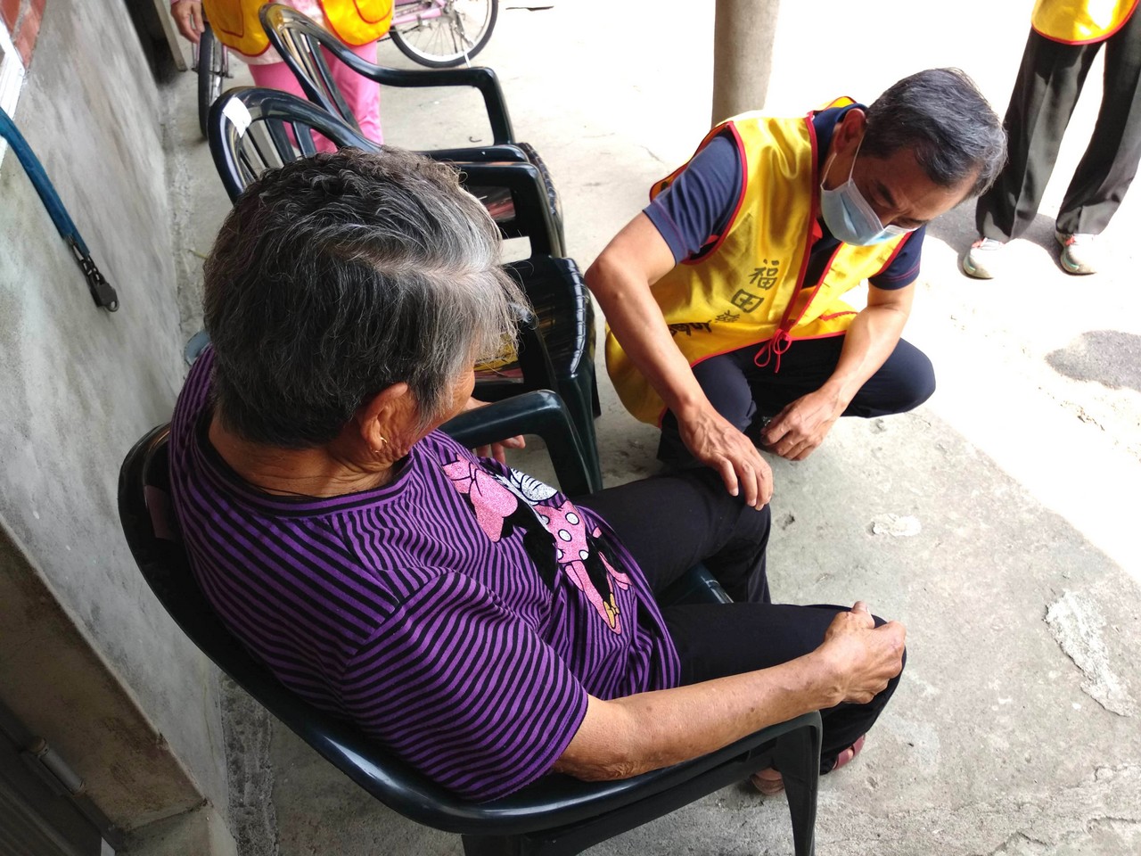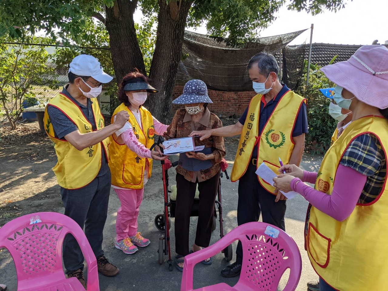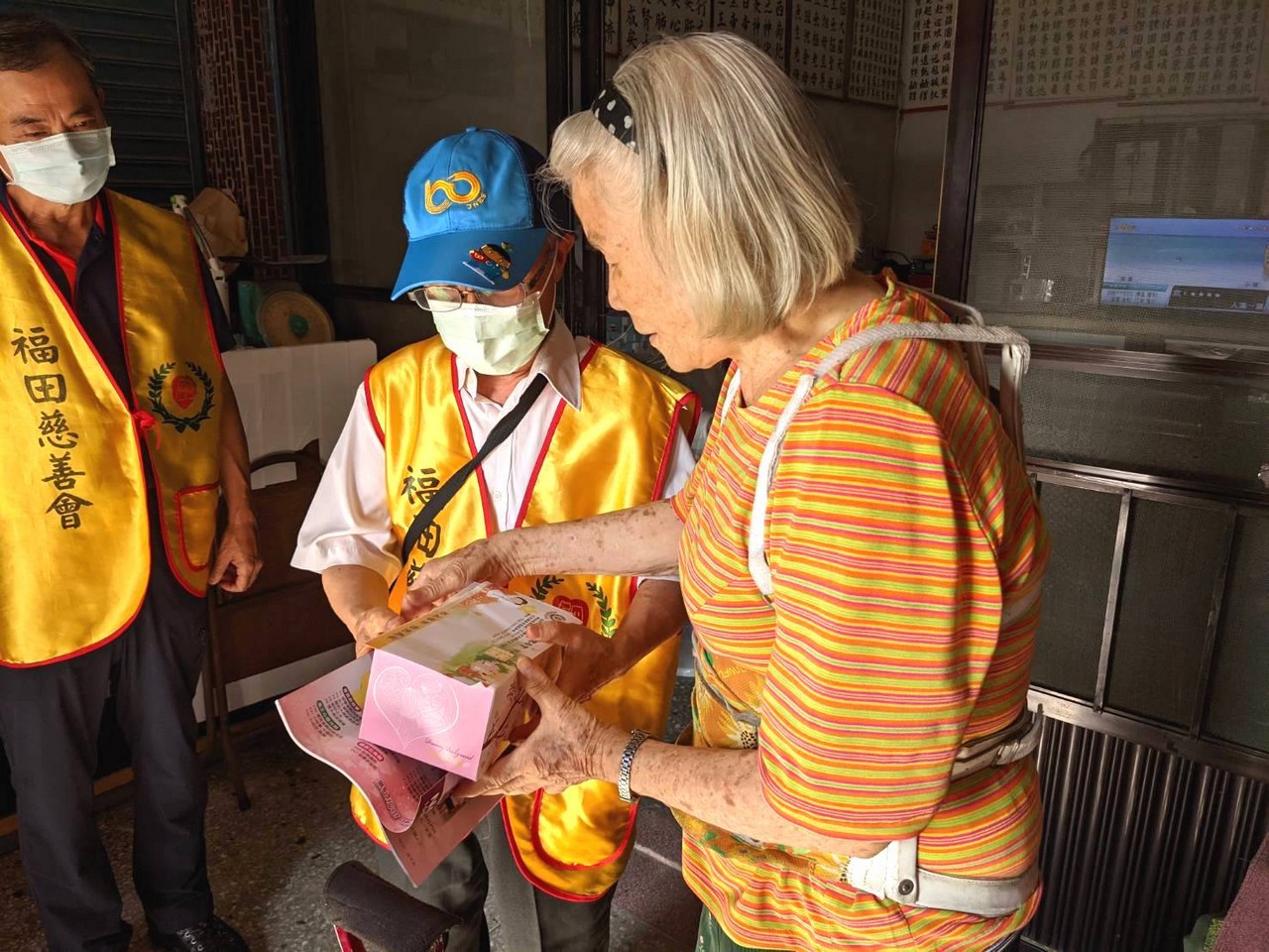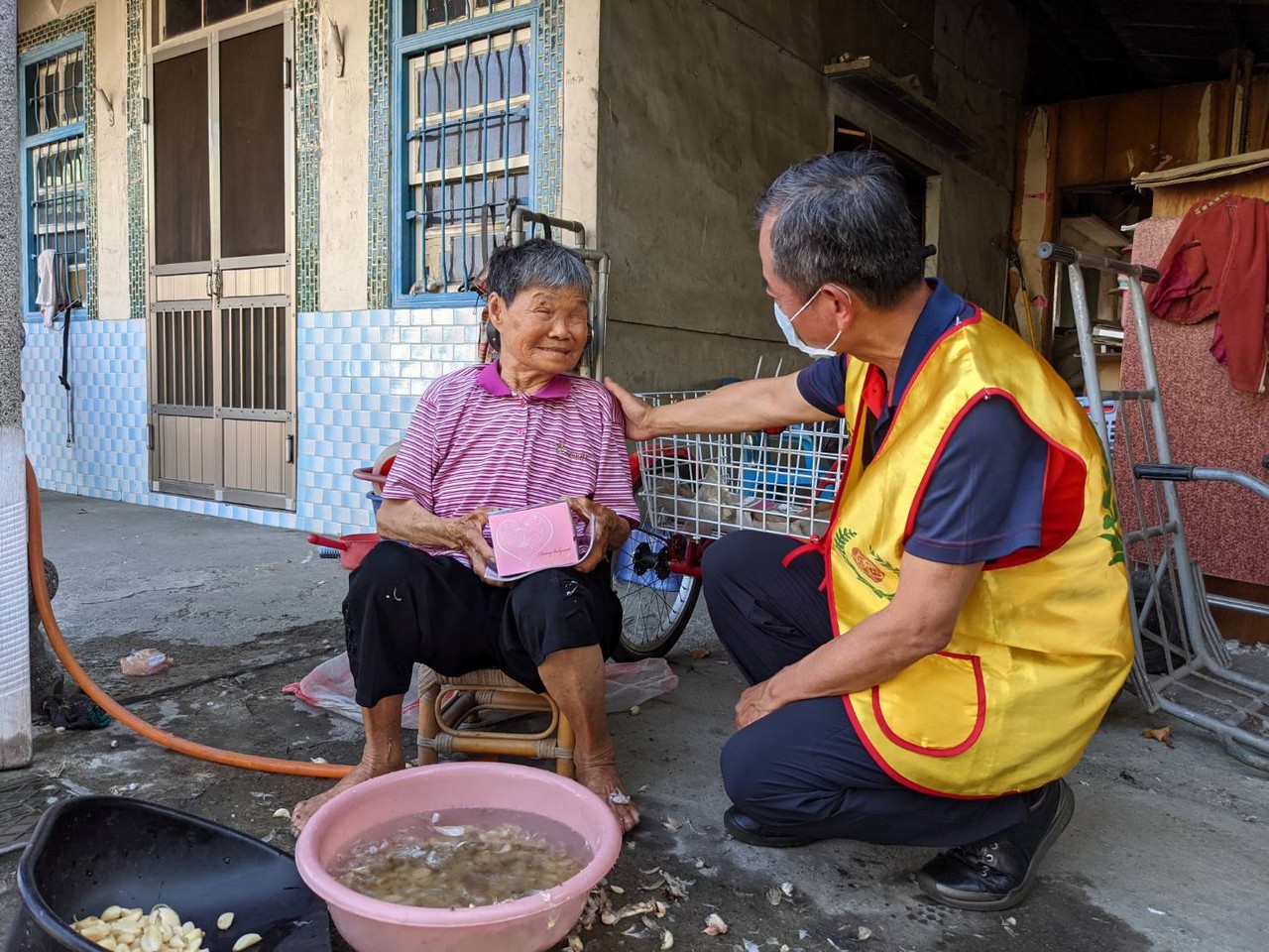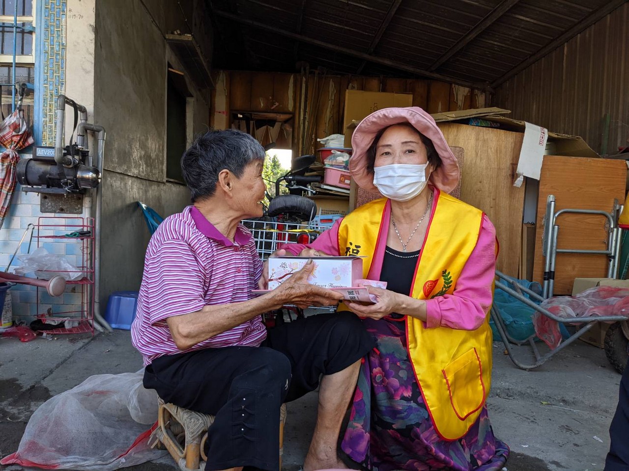 多年來福田持續耕耘,關懷在地獨居長輩,居住惠來里的顏媽媽獨自生活多年,在狹小的房子裡沒人陪伴心卻空蕩蕩,蜿蜒的巷弄,走著一群穿著黃背心的福田志工顯得格外顯眼,遠遠的就能感受到長者心中喜悅之情,熟悉又溫暖為傳遞愛而來。當送達祝福給予一個大大的擁抱後離行前,儼然可見其不捨與感動之情….,「我們明年還會再來,請媽媽要保重喔!」,這不只是志工們與媽媽的約定,更是福田實現本會宗旨不變的堅持。